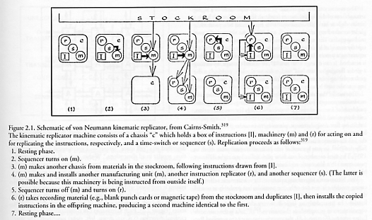 The notion of kinematic machine replication was dealt with only informally by von Neumann. The mathematician envisioned a physical machine residing in a “sea” or stockroom of spare parts (Figure 2.1 and 3.38). The machine has a memory tape which instructs it to go through certain mechanical procedures. Using a manipulative appendage and the ability to move around in its environment, the device can gather and connect parts. The tape-program first instructs the machine to reach out and pick up a part, then to go through an identification routine to determine whether the part selected is or is not the specific one called for by the instruction tape. If not, the component is thrown back into the “sea” and another is withdrawn for similar testing, and so on, until the correct one is found. Having finally identified a required part, the device searches in like manner for the next, then joins the two together in accordance with instructions. The machine continues following the instructions to make something, without really understanding what it is doing. When it finishes, it has produced a physical duplicate of itself. Still, the second machine does not yet have any instructions, so the parent machine copies its own memory tape onto the blank tape of its offspring [278]. The last instruction on the parent machine’s tape is to activate the tape of its progeny.