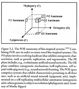By analogy to nature, the design space of bio-inspired hardware systems can be partitioned along the three axes of phylogeny, ontogeny, and epigenesis (the POE model [2430-2432]; Figure 5.2) with the axes defined as follows: the phylogenetic axis involves evolution; the ontogenetic axis involves the development of a single individual from its own genetic material, essentially without environmental interactions; and the epigenetic axis involves learning through environmental interactions that take place after formation of the individual.