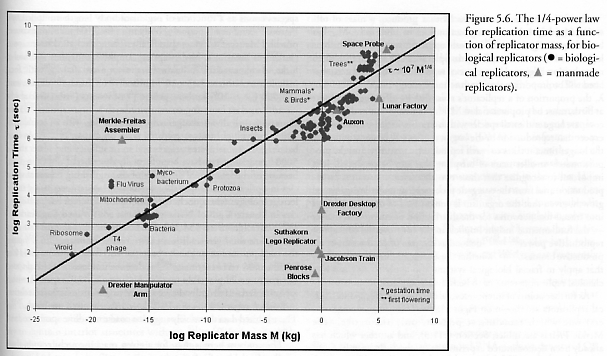 Figure 5.6 shows the replication time (t) as a function of replicator mass (M) for 126 biological species and 9 actual or proposed artificial kinematic self-replicating systems across a size range spanning nearly 20 orders of magnitude, using data drawn from numerous sources [2600] and tabulated in Appendix A. (The exact formula for the trendline drawn in Figure 5.6 is t = 1.78 x 107 M1/4.) It is well-known [2601] that the time of fecundity, the age for maturity, and the regeneration time grow with replicator size. For example, as long ago as 1965 Bonner [2602] found a strong nearly-linear positive correlation between body length and the logarithm of generation time. Our data confirm that replication time in biological systems appears to follow a 1/4-power law function of replicator mass, as explained by the model for allometric scaling laws in biology recently proposed by West et al [2540]. Indeed, age at first reproduction can be shown from first principles [2603] to be proportional to M1/4, a value which has elsewhere been substantiated empirically [2604, 2605]. On the other hand, it is also known that nonfractal mechanical systems such as combustion engines and electric motors exhibit purely geometric 1/3-power, rather than 1/4-power, scaling with mass [2608-2610]. It has been expected that for a given replicator architecture, physical replication speed should be a linear function of geometric dimension (hence a 1/3 power of mass, since mass is volumetric) because nanomanipulator velocity is scale invariant [208] while travel distance decreases linearly with dimension. (See also Section 5.9.5.)