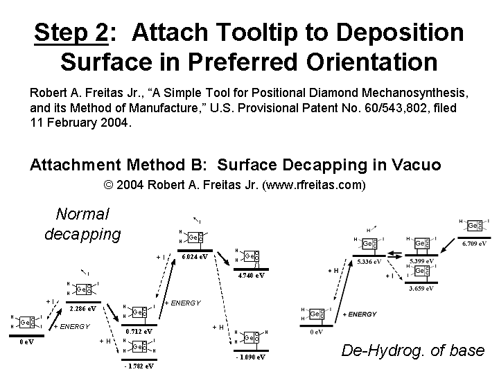 In Attachment Method B (Slide 76), tooltip molecules are bonded to the deposition surface by non-impact dispersal and weak physisorption onto the deposition surface. This is followed by tooltip molecule decapping in vacuum via targeted energy input, producing dangling bonds at the C2 dimer which bond into the deposition surface, thus affixing the tooltip molecule to the surface in the desired tip-down orientation and again creating a low density of preferred diamond nucleation sites. STM-mediated positionally-controlled single-molecule dissociation of an iodine atom from individual molecules of diiodobenzene physisorbed on copper surface was demonstrated experimentally in 2000.
